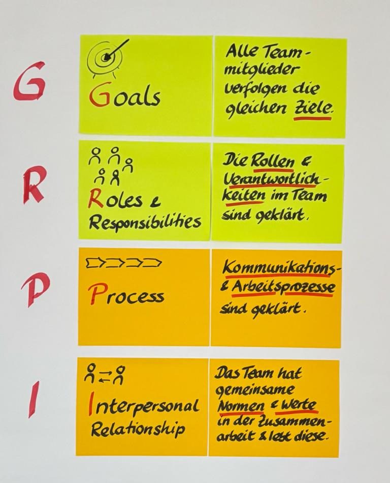 Das GRPI-Modell (von R. Beckhard) beispielsweise unterstützt Teams darin, die Teamorganisation gemeinsam zu erarbeiten. Es basiert auf der Annahme, dass Teams nur dann leistungsfähig sind, wenn sie folgende vier Bereiche der Zusammenarbeit gemeinsam organisieren. Die Bereiche werden in Zyklen erneut angesehen und Vereinbarungen nachjustiert.